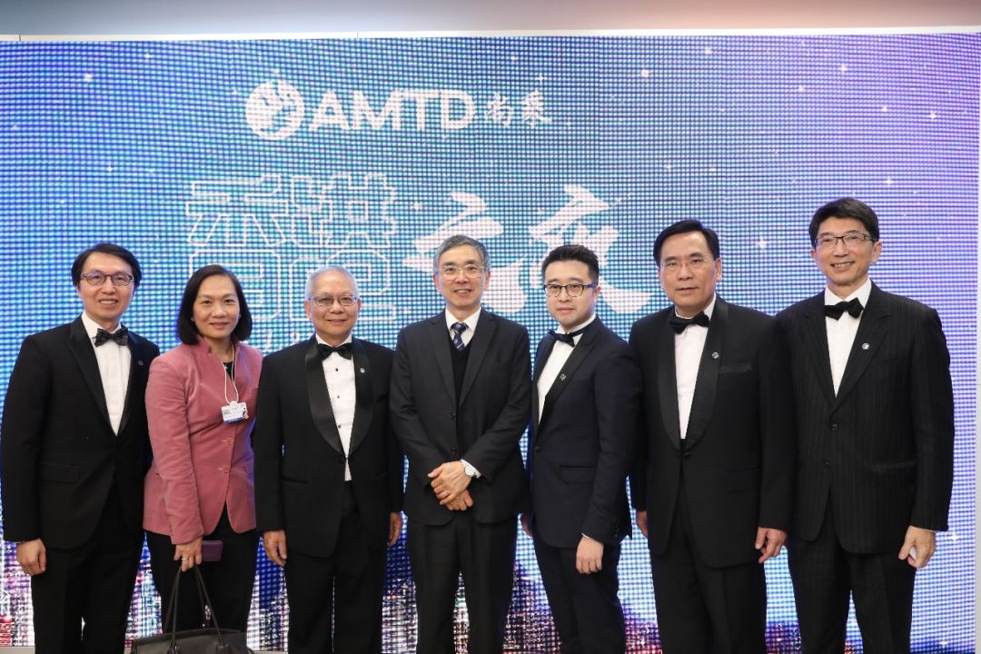 Mr. Calvin Choi, Chairman and President of AMTD Group (third from right), Mr. James Henry Lau, the Secretary for Financial Services and the Treasury (fourth from right), Ms. Helen Wong, Chief Executive, Greater China, HSBC (second from left), Mr. Raymond Yung, CEO of L.R. Capital Group and Co-Vice Chairman of Global Advisory Committee of AMTD Group (first from left), Mr. Marcellus Wong, Vice Chairman of AMTD Group (third from left), Mr. Sin Yat-kin, AMTD Chief of Staff (second from right), Mr. Frederic Lau, CEO of Capital Markets & Advisory of AMTD Group (first from right)